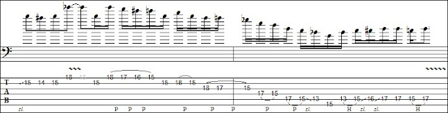 She's also quite fond of lateral or horizontal legato runs along a single string, as in this example from her original track “After Insanity”, which is played with a five note per beat rhythm – however, this is split into a 16th note triplet followed by a pair of regular sixteenth notes, so think “1 & a 1 &” when you're counting. This run uses the A natural minor running from the G (b7) at the 15th fret to the D (4th) at the 7th fret G. Don't neglect the rhythmic elements when practicing these licks, so tap the foot firmly on each downbeat to ensure you're grounded.